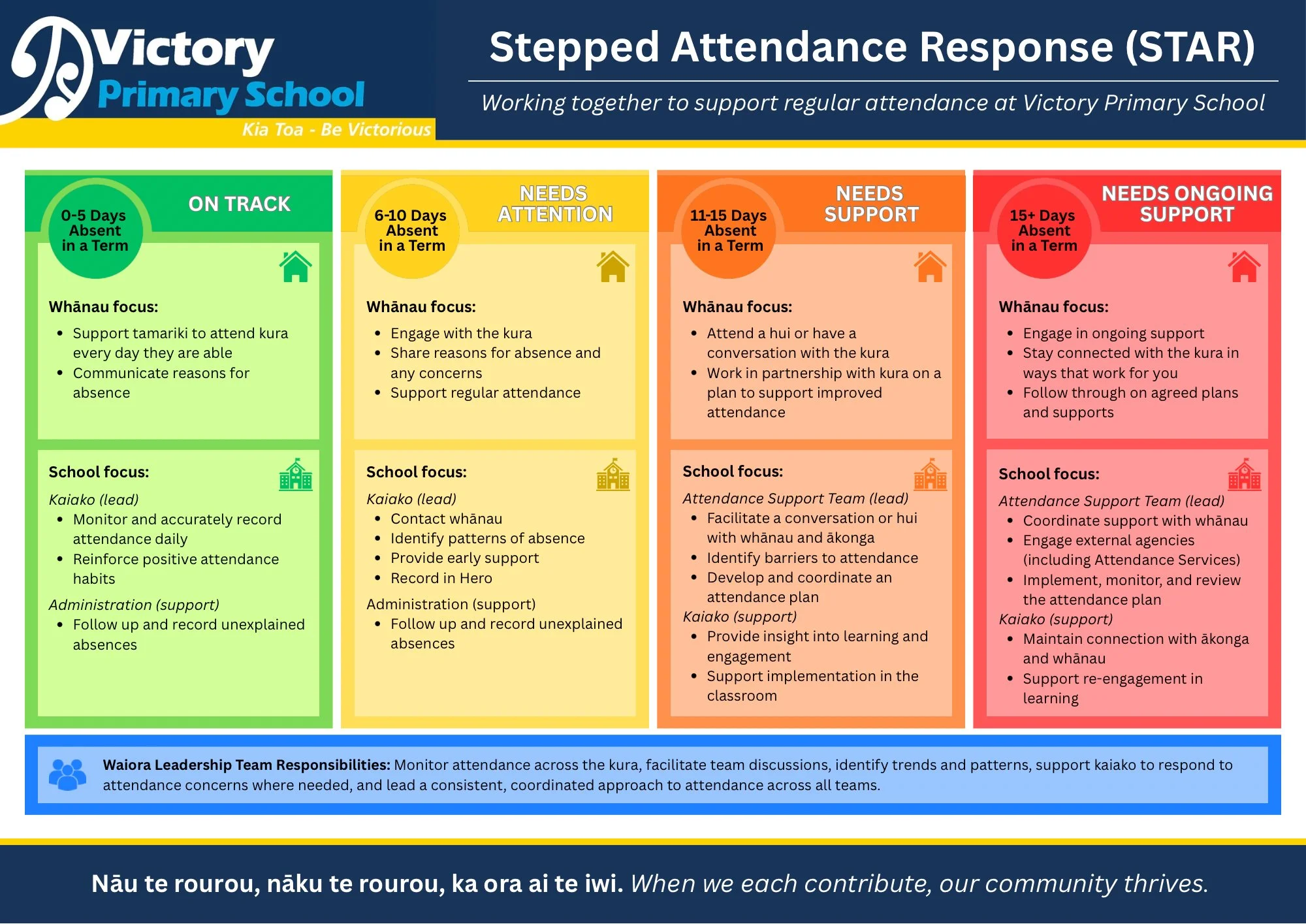 At Victory Primary School, we know that regular attendance is one of the most important factors in a child’s learning and wellbeing. When tamariki are at school every day, they build strong relationships, develop confidence, and make consistent progress in their learning.